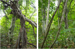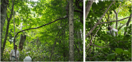 - 成長した木に巻きつくように伸びてゆく山ぶどう。成長が早い山ぶどうは、放っておけば木が倒れる原因に。定期的に採ってあげることは、木の生長を助け、森を守るためにもいいことなのです。