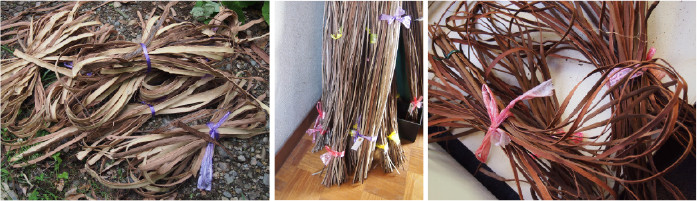 - 作品に使うのは山で育った天然の木の皮。素材は木がたっぷり水分を蓄えている5月末〜6月末くらいまでしか採れません。